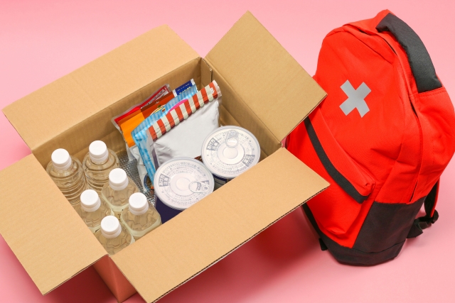 ・飲料水(1人1日3リットル×3日分が目安)、食料、携帯トイレ、LEDライト、モバイルバッテリー、現金、常備薬、運転免許証、保険証、ハザードマップ、マスク、ヘルメット、防寒具、軍手、雨具、除菌シート、生理用品など